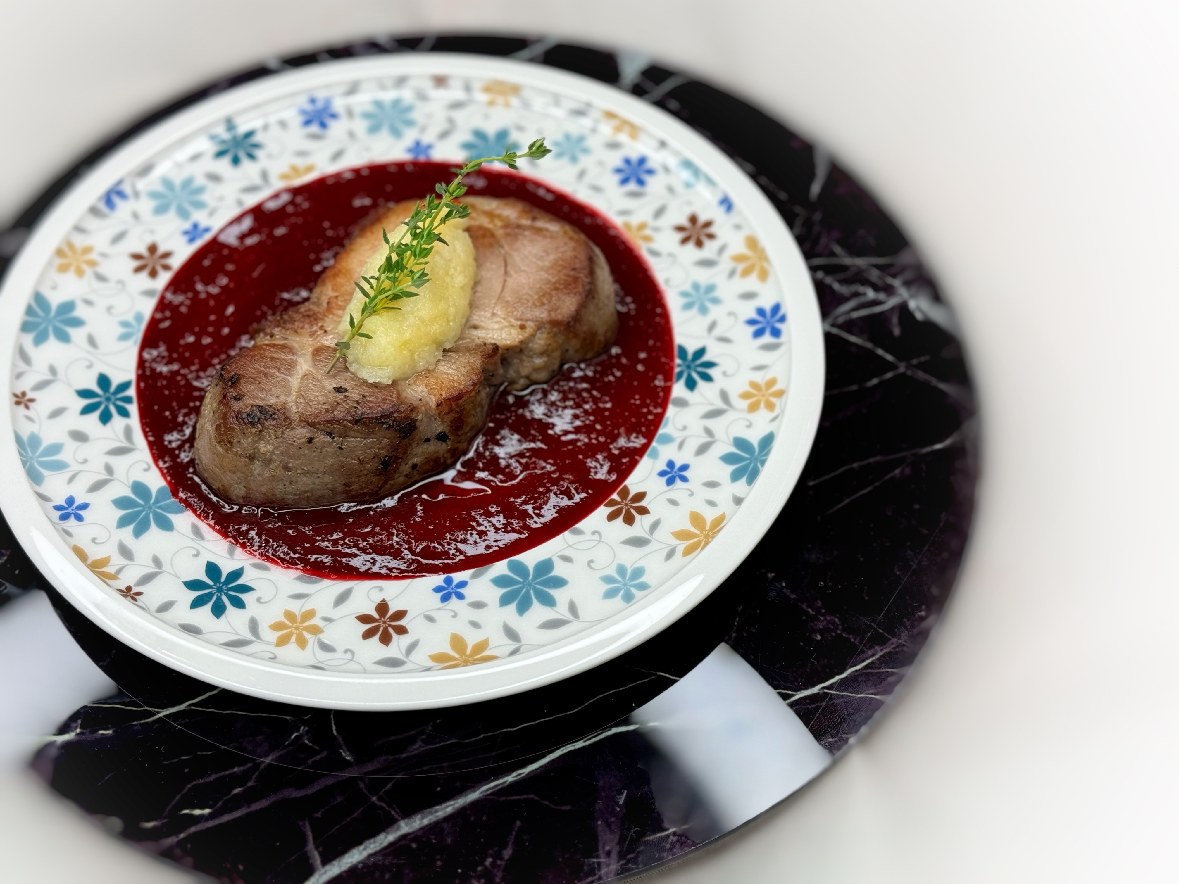 Буженина маринуется с корнем хрена в течении суток, потом цельным куском запекается в печи до образования румяной золотистой корочки. Подается на гарнире из цельных сочных вишенок, с добавлением пряных специй. Сверху на блюде находится перетертое зеленое яблоко со сливочным хреном. Блюдо отлично подходит гостям, ищущим новые вкусовые ощущения, оттенки и сочетания.