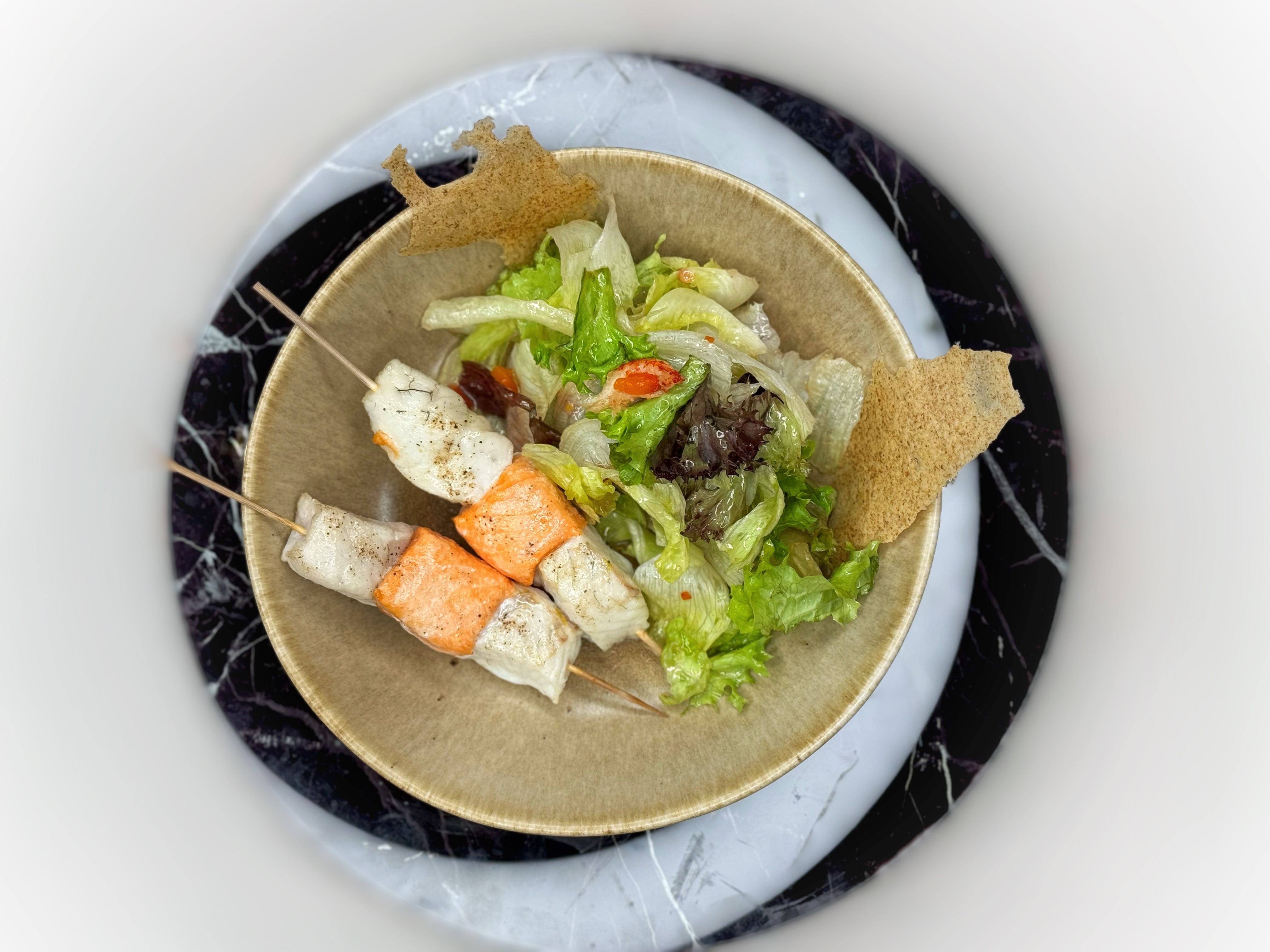 Шашлычки из лосося и судака с салатом с раковыми шейками, запеченным сладким перцем, огурцами и морошковым дрейсингом.